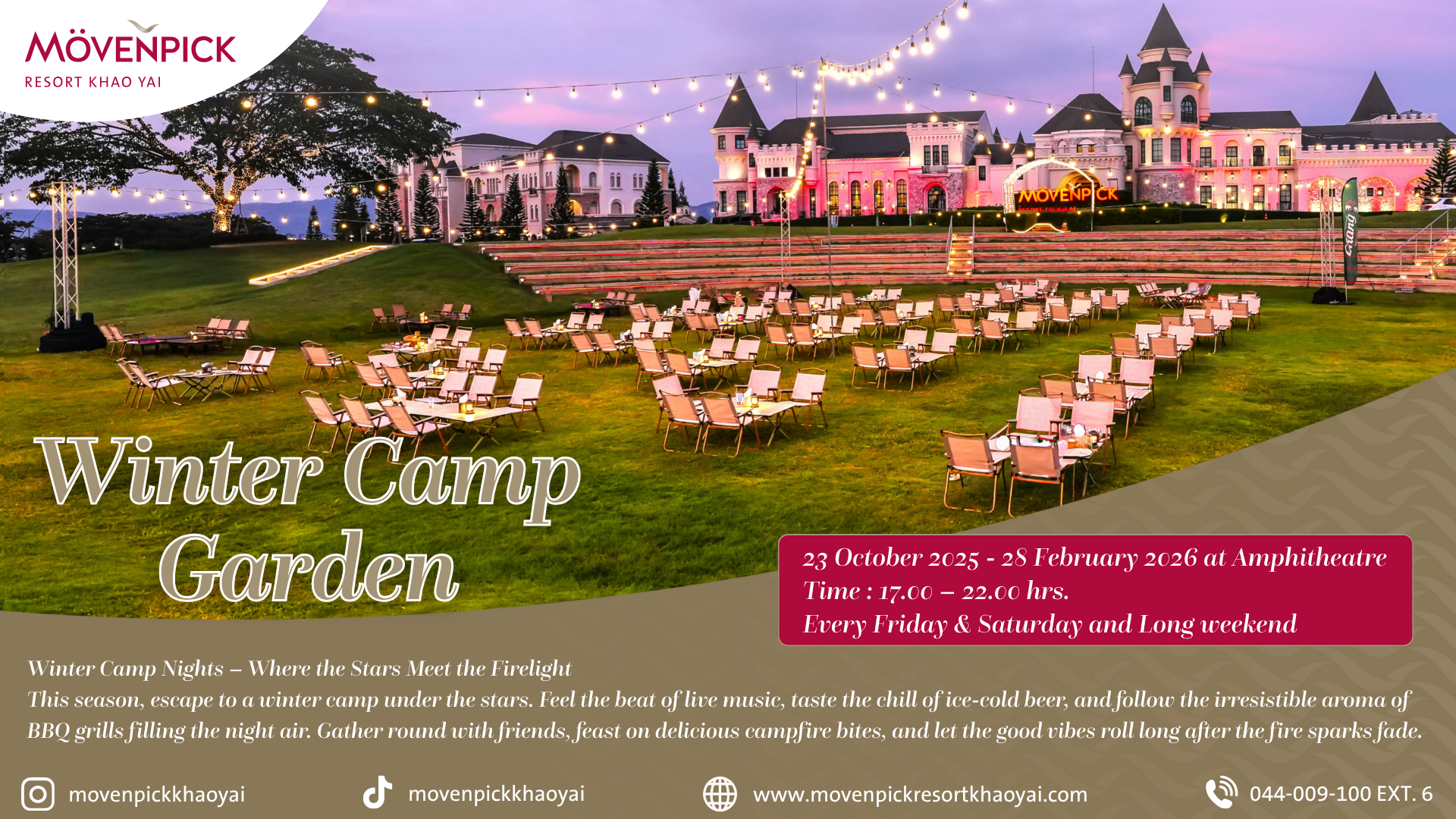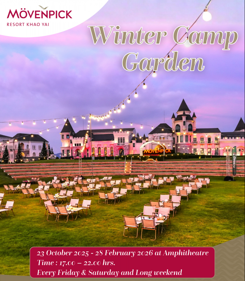 เมื่อฤดูหนาวกลับมาเยือน เขาใหญ่ก็เริ่มสัมผัสได้ถึงลมหนาว ท่ามกลางอากาศเย็นสบาย และปีนี้ Mövenpick Khao Yai ได้เติมมนตร์เสน่ห์ให้ Amphitheater ของรีสอร์ทเป็นแหล่งชิลใหม่ “Winter Camp Garden” สุดพิเศษ ที่อบอวลด้วยแสงไฟระยิบระยับ รื่นรมย์กับเสียงดนตรีสดเคล้ากับลมหนาว และกลิ่นอาหารหอมๆจากเตาย่าง